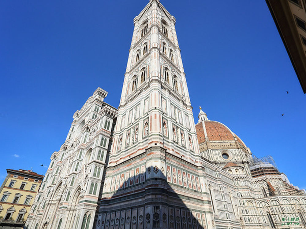 圣母百花大教堂是世界五大教堂之一,是天主教佛罗伦萨总教区的主教座堂,由大教堂、钟塔与洗礼堂构成。洗礼堂位于大教堂西边数米,为白色八角形罗曼式建筑。钟塔高85米,属哥特式建筑,由六层方型结构向上堆叠成柱形,外墙铺白色大理石,纯净优雅。乔托钟楼:是意大利天才艺术家欧洲绘画之父乔托的杰作,钟楼高84.7米,是由红白绿大理石砌成,其中有很多精致的雕塑,整个外形细长优雅,色调和对面的洗礼堂相得益彰。圣乔凡尼礼拜堂,面对百花大教堂的八角形教堂,建于5世纪~8世纪间,是托斯坎尼地区罗马式建筑的代表。