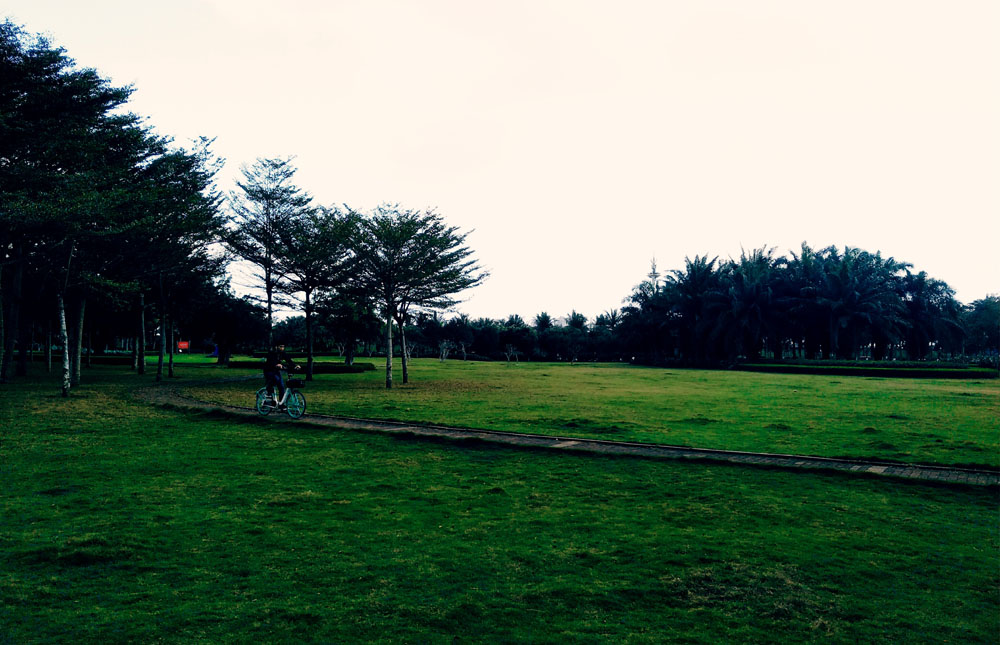 这是一条由机场跑道改建而成的城市道路。海口大英山机场,20世纪30年代建成,90年代前一直由军民合用,南海舰队航空兵进驻。海南建省开发开放,数十万大陆孔雀渡海南飞,这个位于城边的老机场迅速饱和。记得90年代我第一次飞海南,飞机是在一片楼房的灯光火海中瓢瓢降落。1999年,新的美兰机场建成,大英山机场结束了自己的历史使命,机场场区融入海口市区,机场跑道演变成国兴大道。