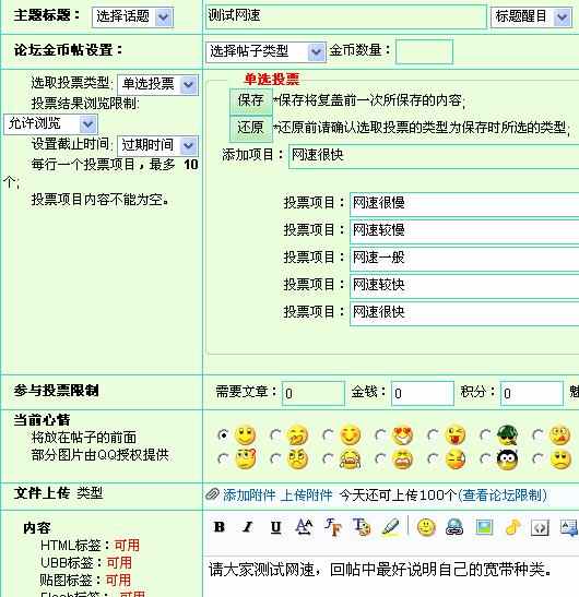最后再点击“添加”,就将已经输入的第五个选项添加上了。然后在帖子的正文内输入“请大家测试网速,回帖中最好说明自己的宽带种类。”如下图: