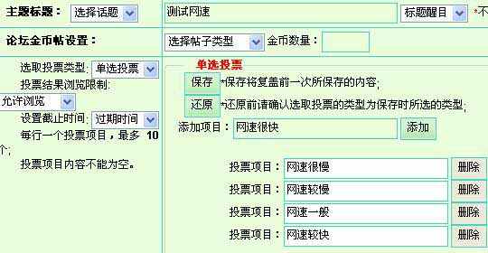 请看上面图中此页面的选项有:一是主题标题,这就是投票帖的题目。二是单选投票右边还有一个下拉框,里面有三项选择:单选投票、多选投票和问卷调查。三是允许浏览和投票截止后。四是设置截止时间等等。这些都需要发帖者慢慢摸索,下面我就单选投票作如下说明。如下图: