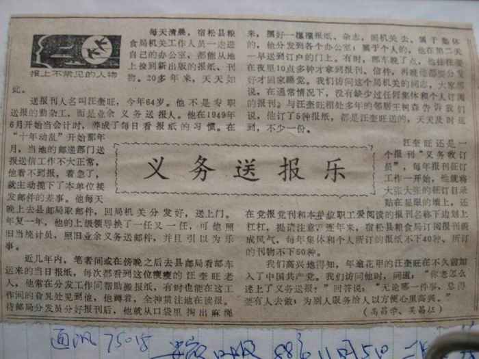 安徽日报1988年11月5日二版刋登的由高天报道表彰汪老的通讯《义务送报乐》文章复印件