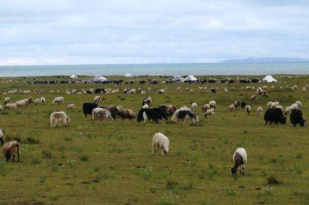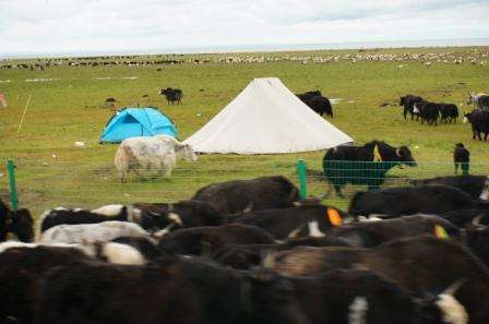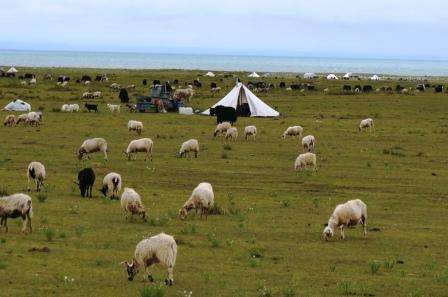 天湖一色,牛羊成群。好景观!欣赏了。 江山处处多娇!