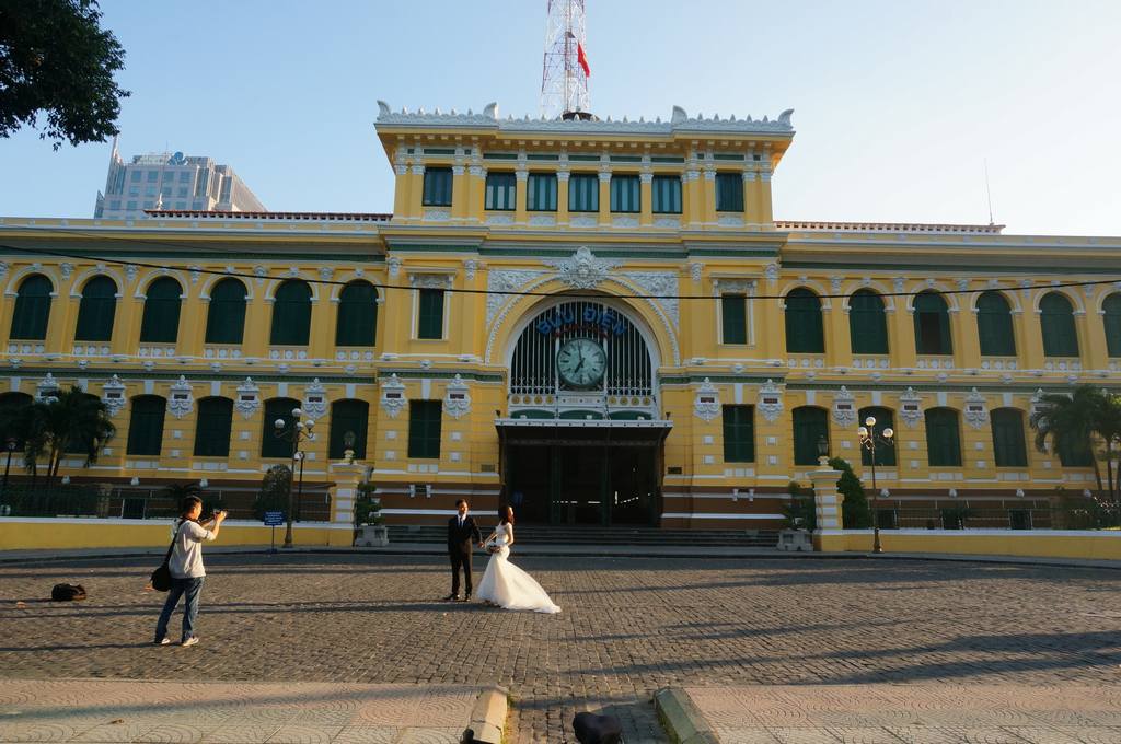 西贡邮局建于十九世纪末,为法国建筑师设计,大厅内装饰华丽,极富古典气息,宽阔的大厅两侧是业务柜台,中部由外至内是环形长椅,大厅左右两侧上方各有一张越南地图,据说是当年法国地理学家手绘,穹顶、圆形花窗、华丽的大吊灯、花型壁灯,电风扇等,无不透着哥特式建筑的风格。中央邮局至今还在使用,允许人们尽情拍照,也可以坐在那里发呆或观赏大厅里的一切。