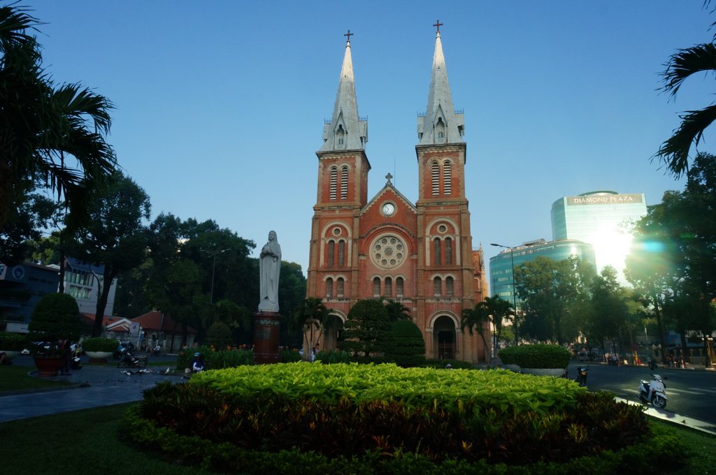 红教堂是西贡最著名的地标建筑,位于西贡市中心,是最热闹和繁华之处,中央邮局就在其左侧,十分便利。 教堂原名为西贡王公圣母教堂,因其使用红砖建造故而得名,建造所用红砖全部从法国运来,百余年过去,色泽依然鲜明,毫无褪色。 大教堂仿照巴黎圣母院钟楼的设计,造型匀称,庄严雄伟,两座塔楼高达四十米,直入云霄。教堂前还有上一座重达四吨的圣母玛丽亚雕像。 教堂外部门廊等部位布满精美雕饰,内部四周均为小祈祷室,每一间的神龛、雕塑及装饰均不相尽同,于变化中尽善尽美。